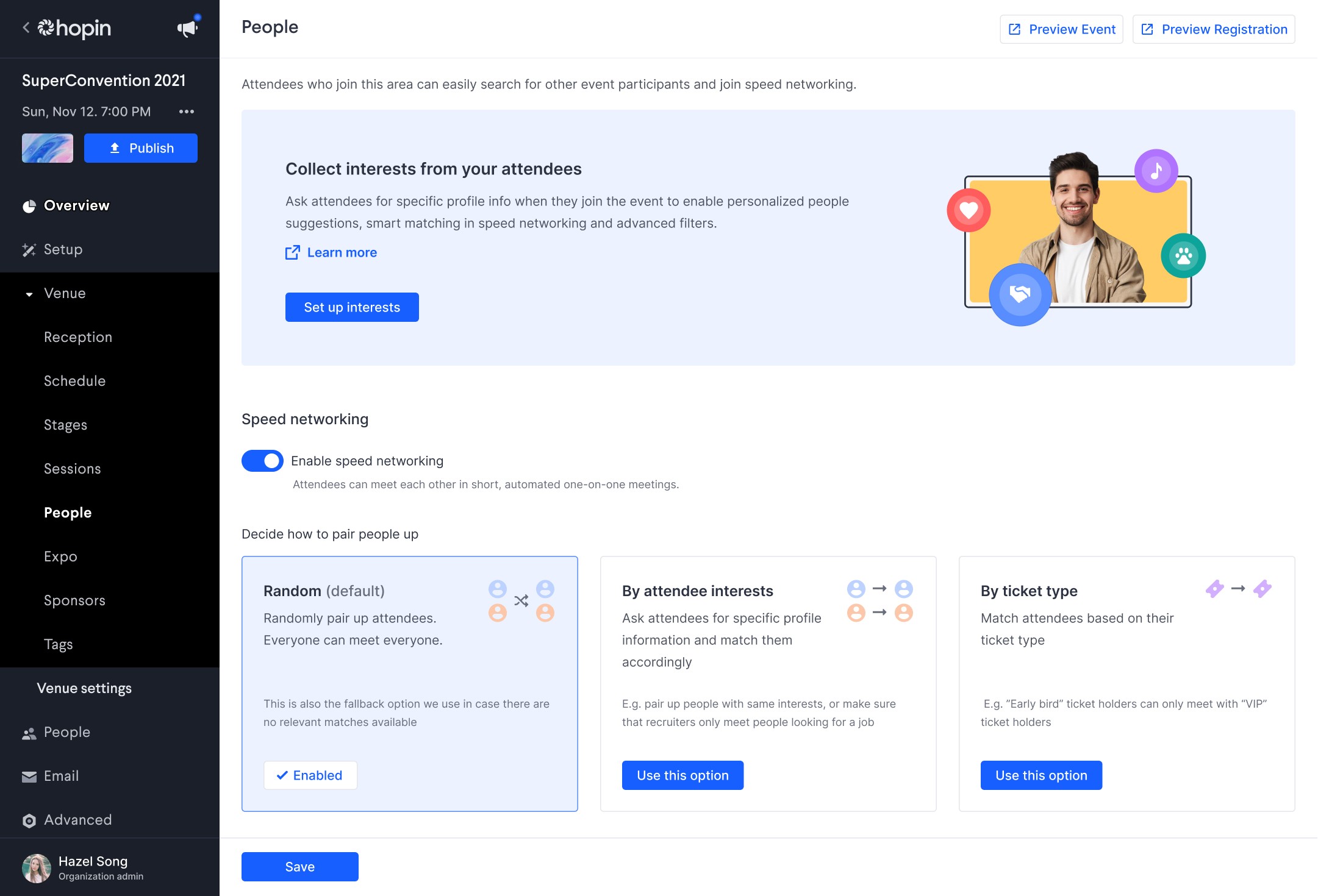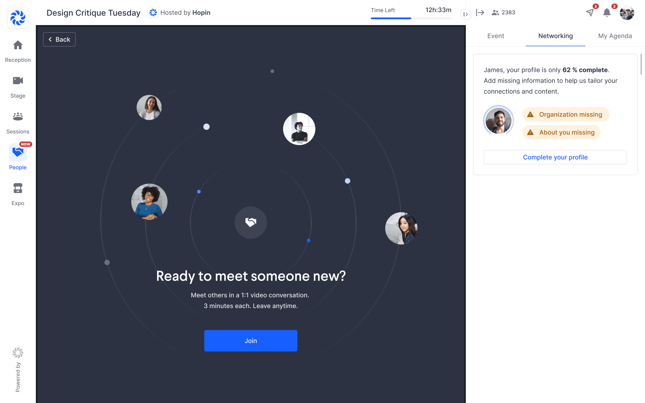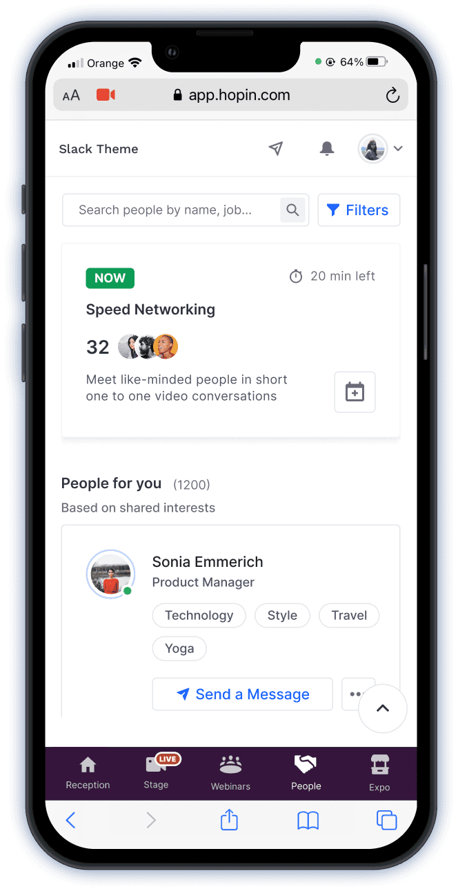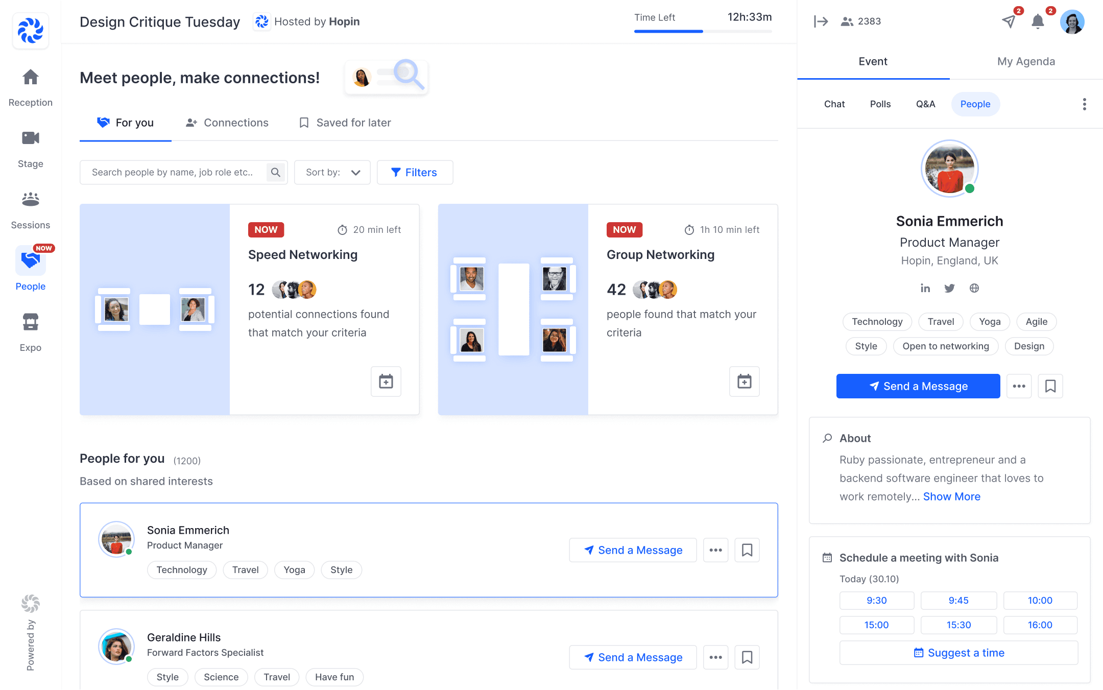The new design provides a separate section on the left sidebar called "People" where attendees can join one-on-one speed networking sessions, and browse the list of people using advanced filtering options.