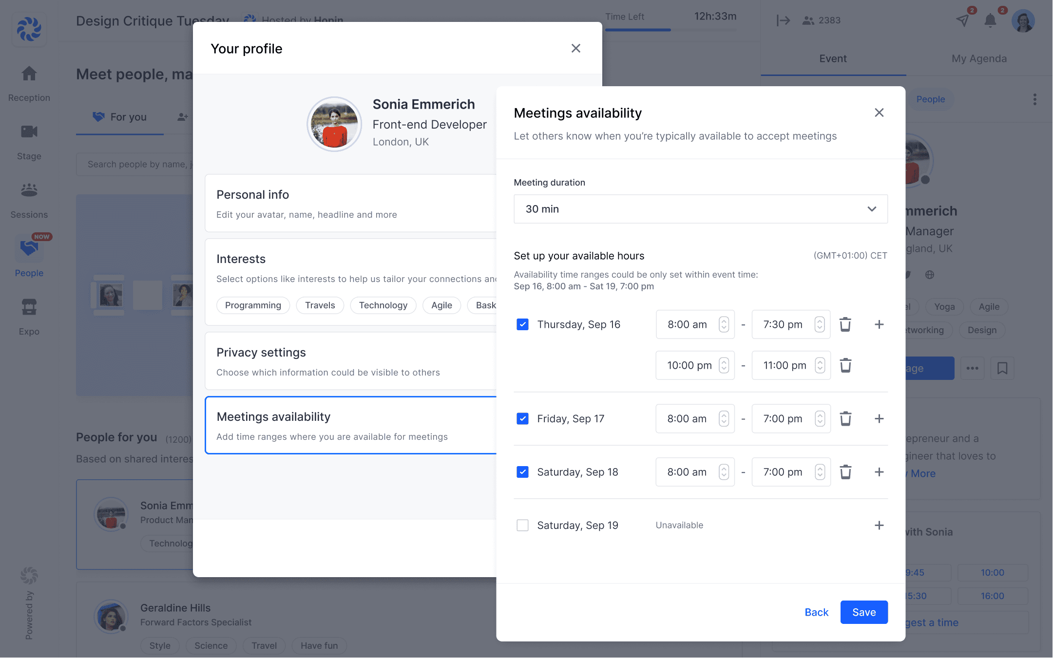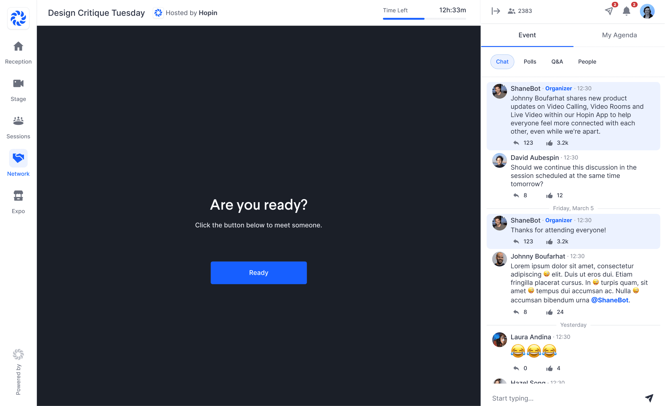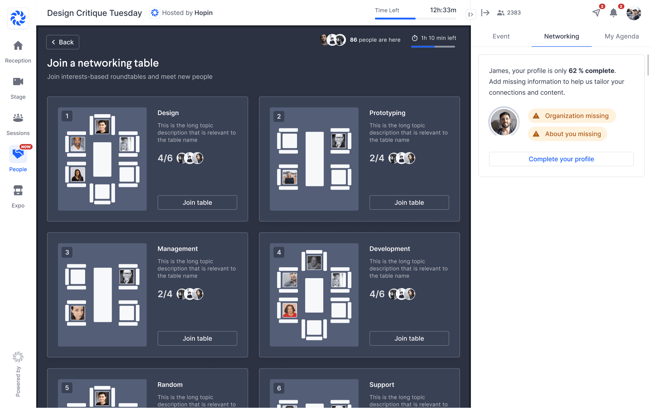 The new design provides a separate section on the left sidebar called "People" where attendees can join one-on-one speed networking sessions, and browse the list of people using advanced filtering options.