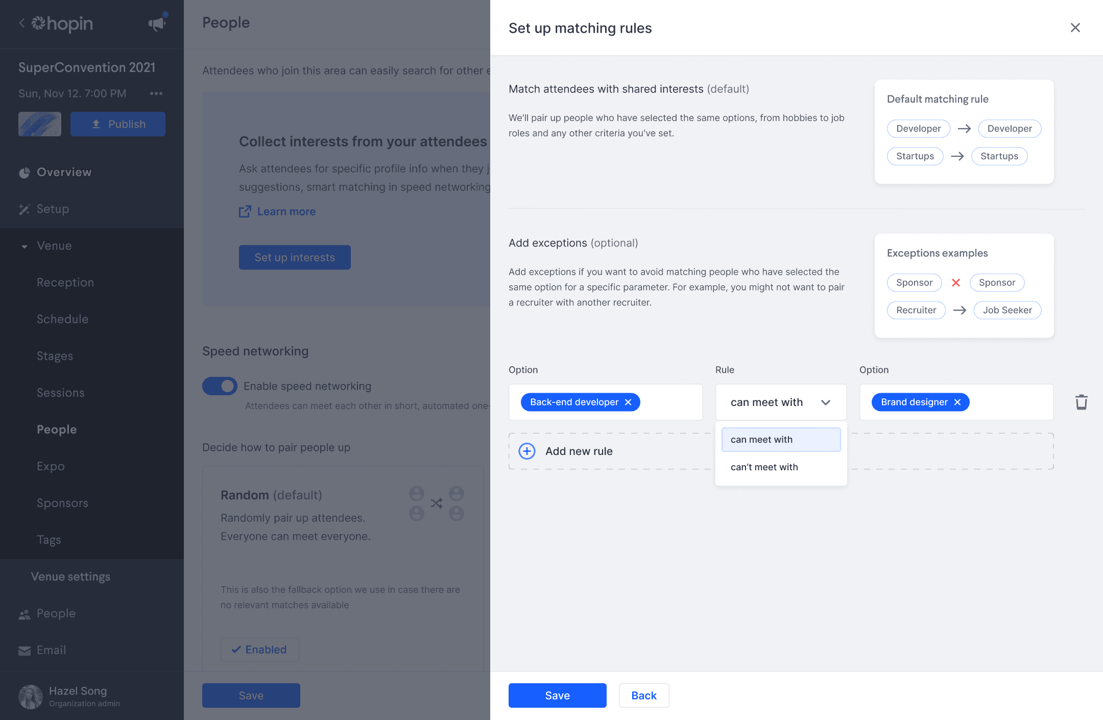 Customization: Organizers require granular control over matching rules, as every event is unique.