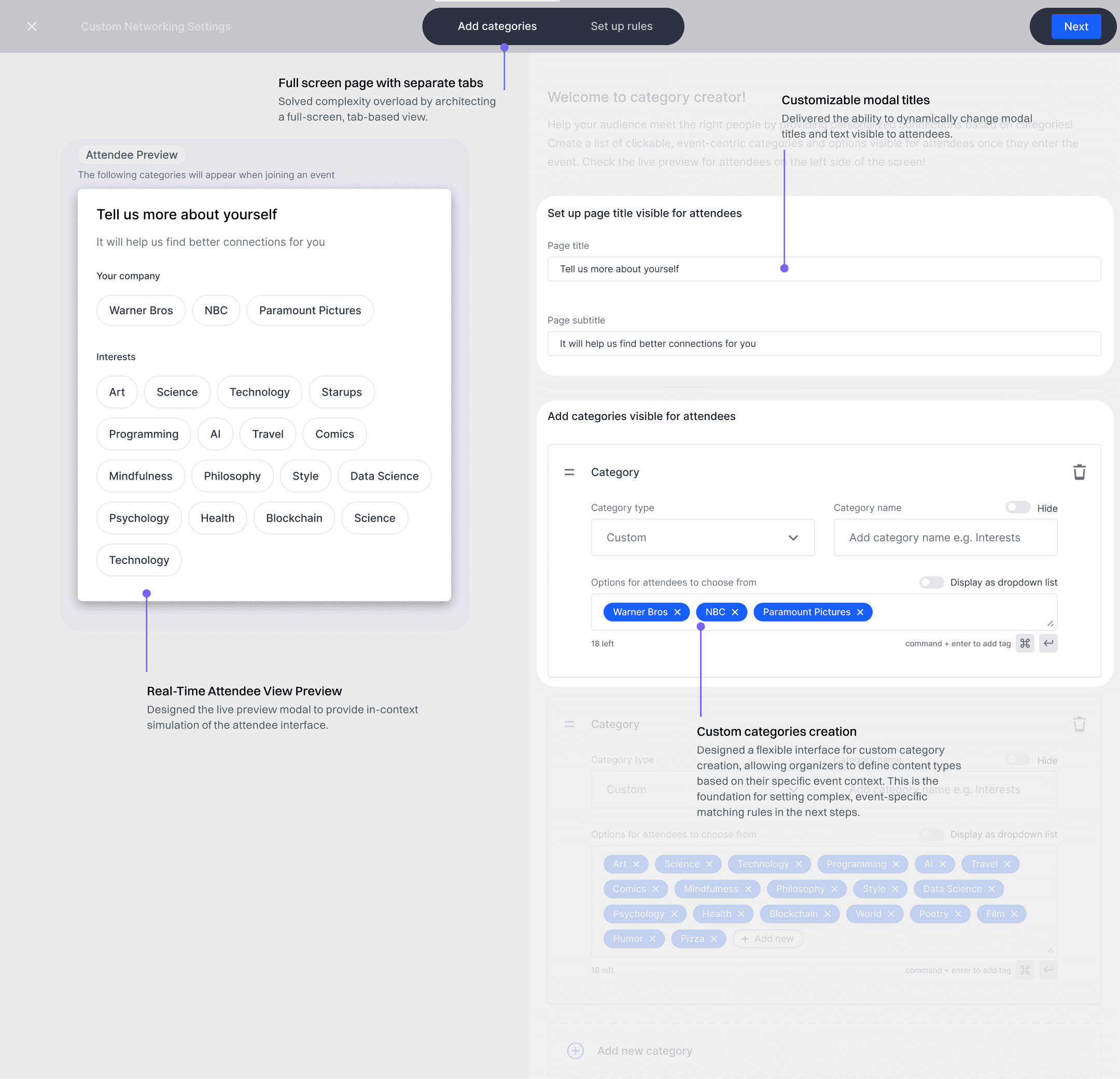 For first attempt, I designed a full screen Custom Networking Settings page where organizers could create their own categories for data collection and set up rules in the next step.