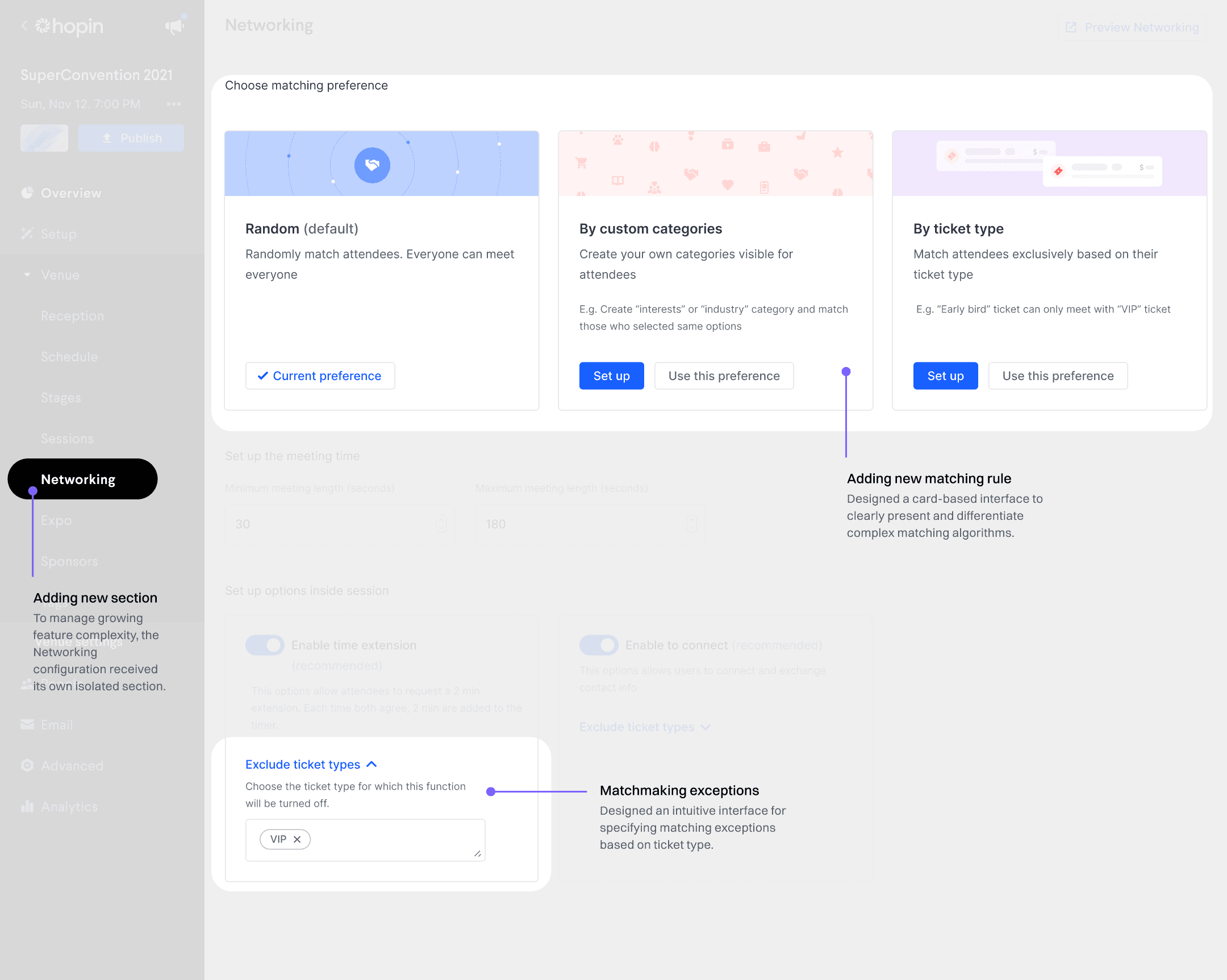 I redesigned the Networking experience during virtual events pivoting from "random roulette" to Smart Matching.